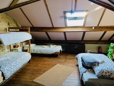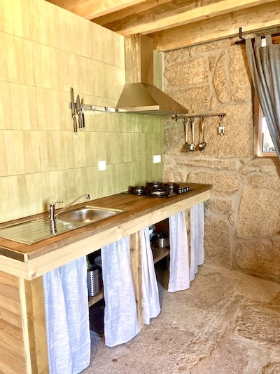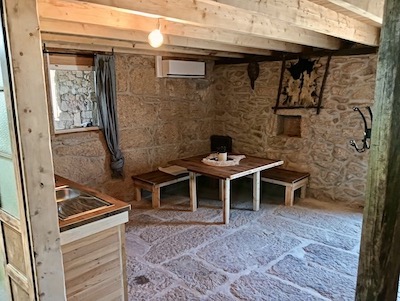 No rés-do-chão encontra um espaço naturalmente fresco graças às grossas paredes de granito. Há uma cozinha artesanal em madeira, uma sala de estar com um confortável sofá de canto e uma mesa robusta perfeita para longas refeições ou noites de jogos. A casa de banho privativa com duche, sanita e lavatório também se situa neste piso. A escada de madeira leva ao mezanino aberto, com detalhes em madeira, claraboia e camas confortáveis para 1 a 5 hóspedes.